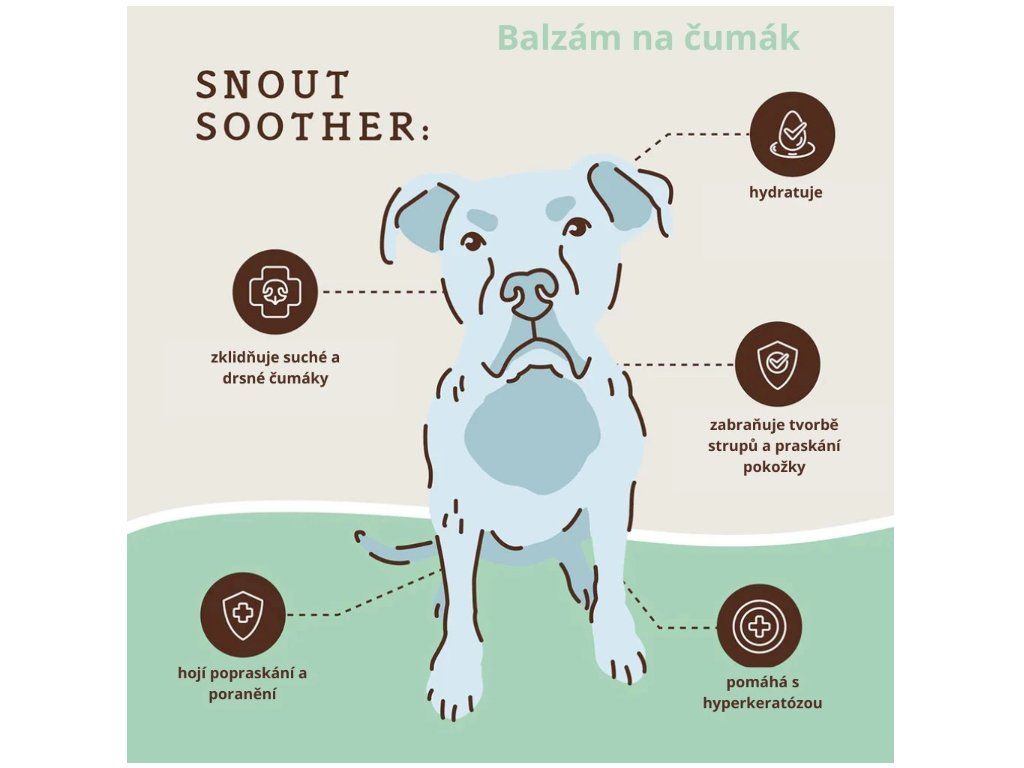 Má váš pejsek suchý, popraskaný nebo zarudlý nos? Snout Soother je přírodní balzám, který léčí, hydratuje a chrání i ty nejcitlivější čumáčky. Je ideální pro každodenní péči, ale i pro řešení problémů jako je hyperkeratóza, strupy nebo podráždění. Díky účinné směsi oleje z Kukui ořechů, jojobového oleje a vitamínu E pomáhá zjemnit i hrubou kůži a vrátit čumáčku zdravý vzhled.