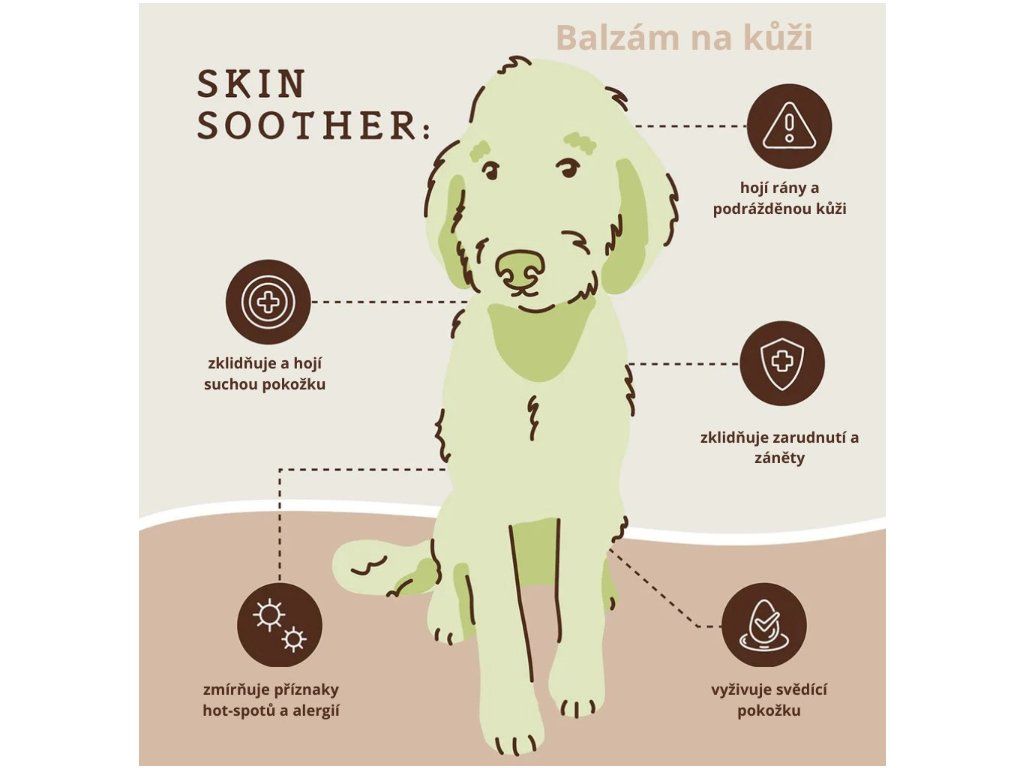 Skin Soother – úleva pro suchou a podrážděnou pokožku. Okamžitě zklidňuje, hojí a chrání psí kůži před svěděním, podrážděním, infekcemi a suchostí. Síla kadidla, myrhy a rakytníku v kombinaci s dalšími přírodními oleji nabízí šetrné, ale účinné řešení pro široké spektrum kožních problémů.