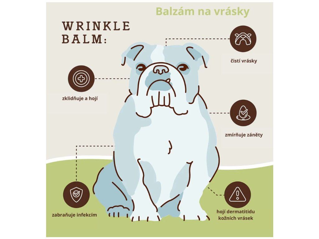 Speciálně navržený balzám pro citlivé kožní záhyby – ideální pro plemena s vrásčitým obličejem (buldočci, mopsíci, sharpeiové aj.). V záhybech se snadno drží vlhko a nečistoty, kůže se pak rychle podráždí. Wrinkle Balm pomáhá léčit, zklidňovat a předcházet potížím jako jsou: