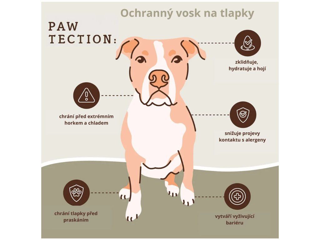 PawTection – Maximální ochrana tlapek v každém počasí. Vytváří ochrannou bariéru, která chrání tlapky před horkem, solí i mrazem. Přírodní směs vosků a olejů pomáhá uzamknout vlhkost a udržet tlapky vyživené a zdravé.